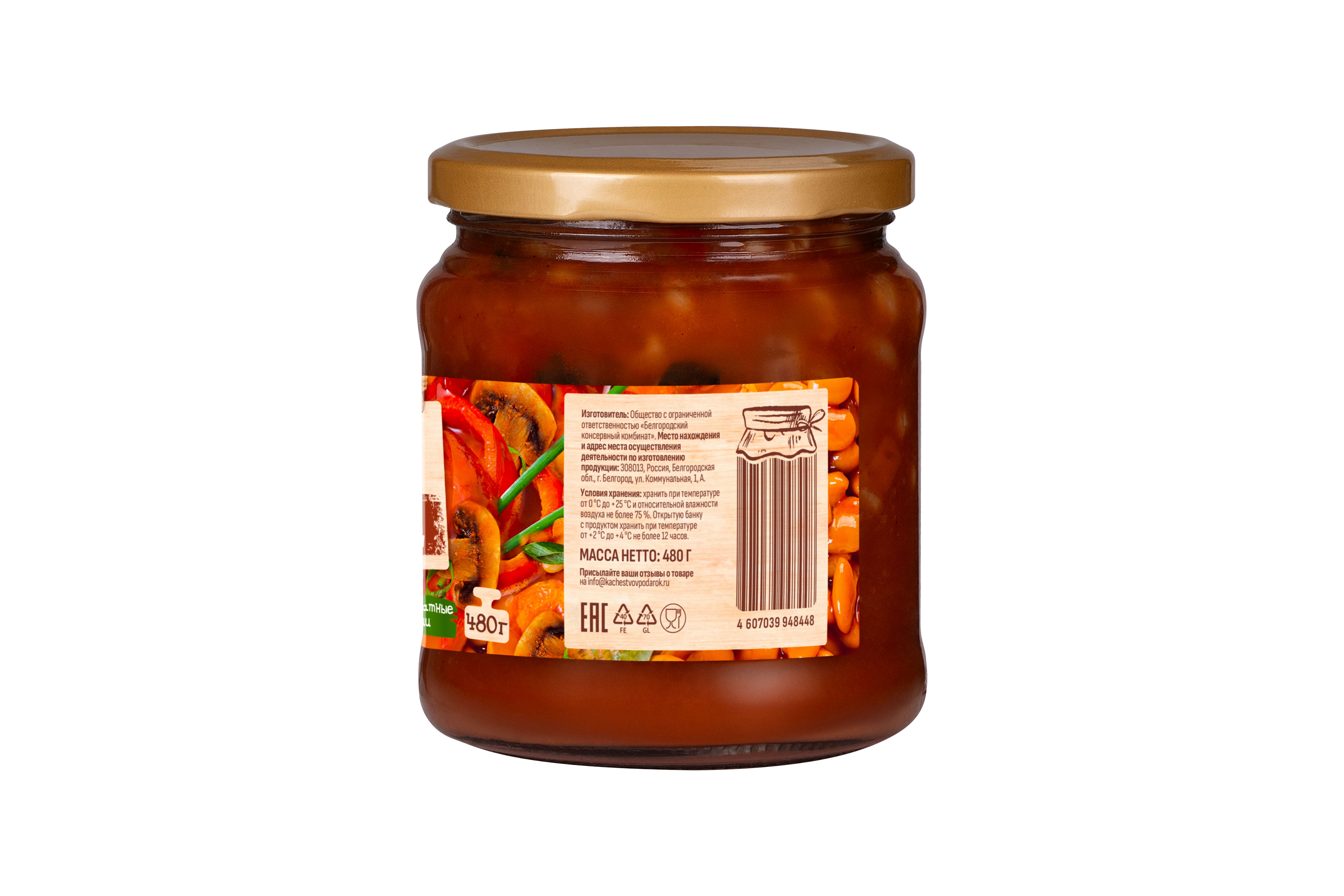 Фасоль белая лопатка, вода питьевая, паста томатная, сахар, соль, масло растительное рафинированное дезодорированное, грибы шампиньоны, морковь, перец сладкий, лук сушеный, перец душистый молотый, чеснок.