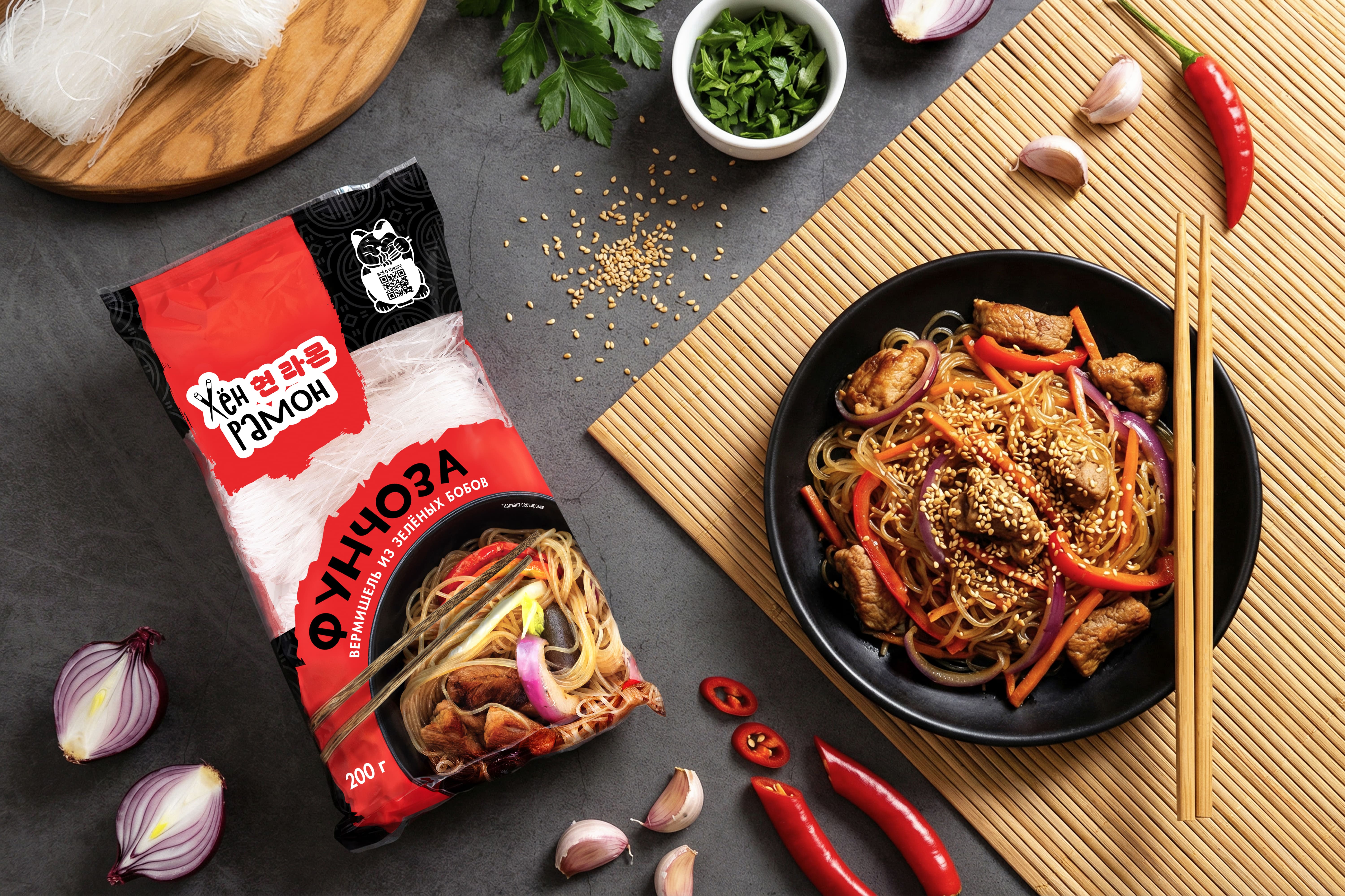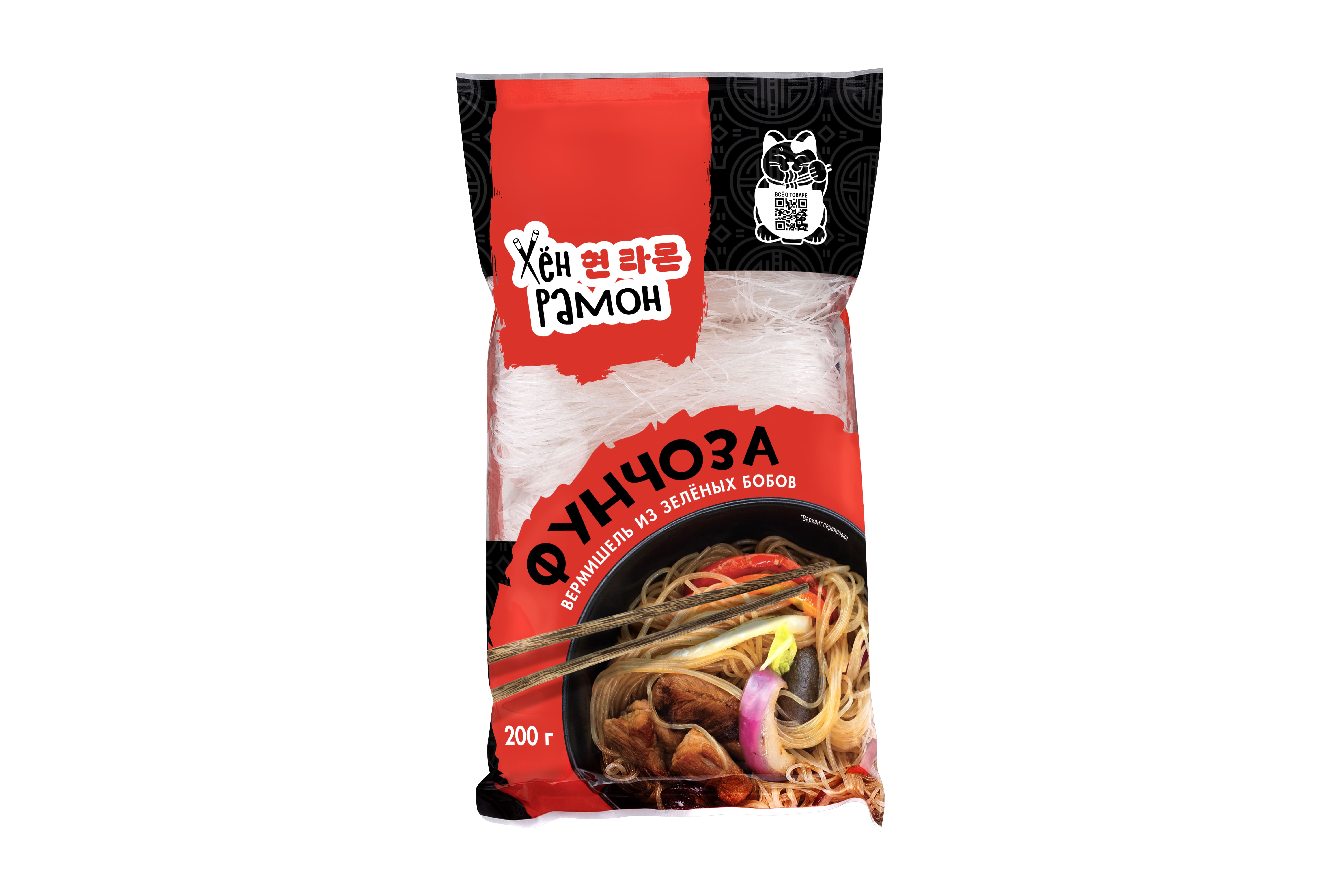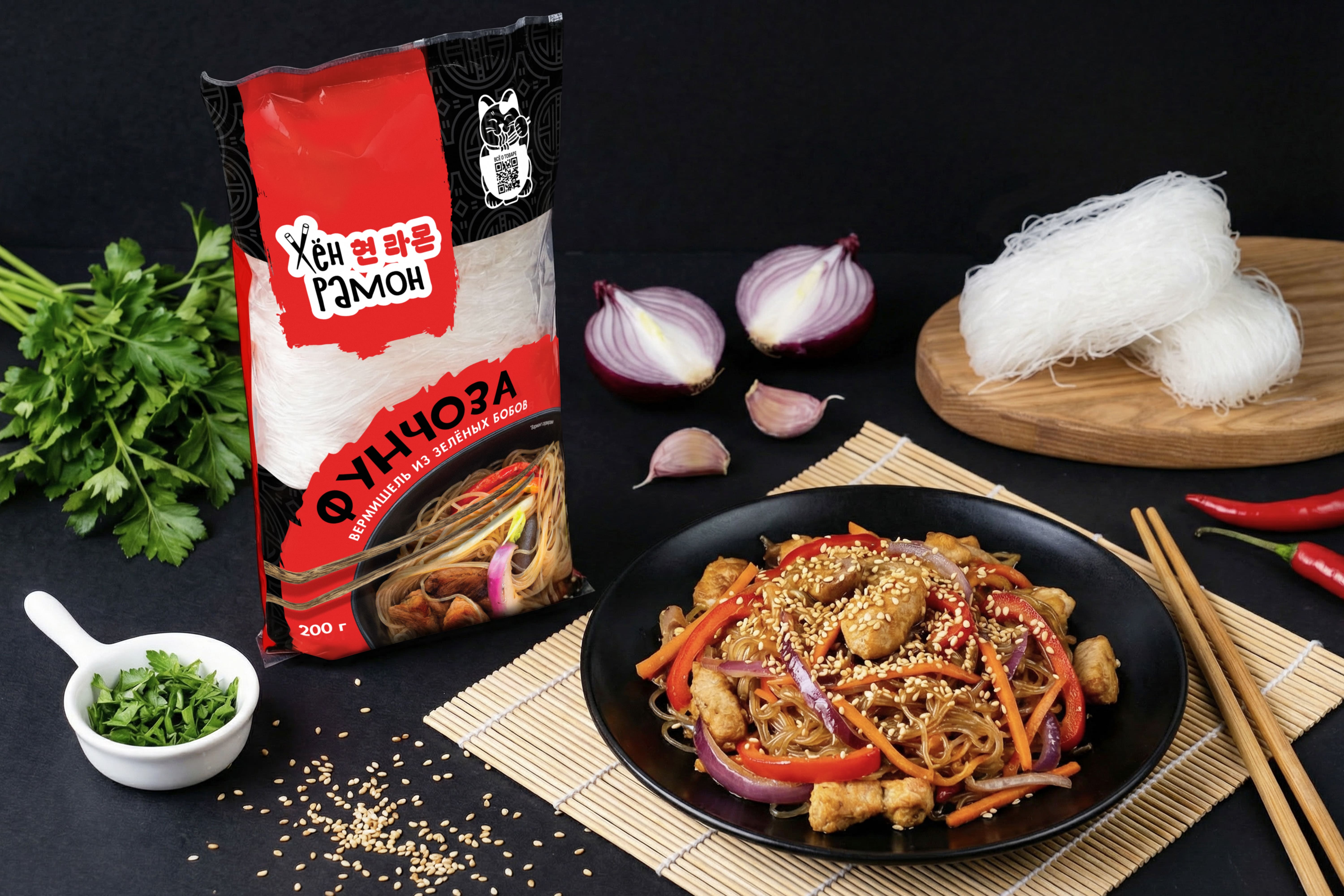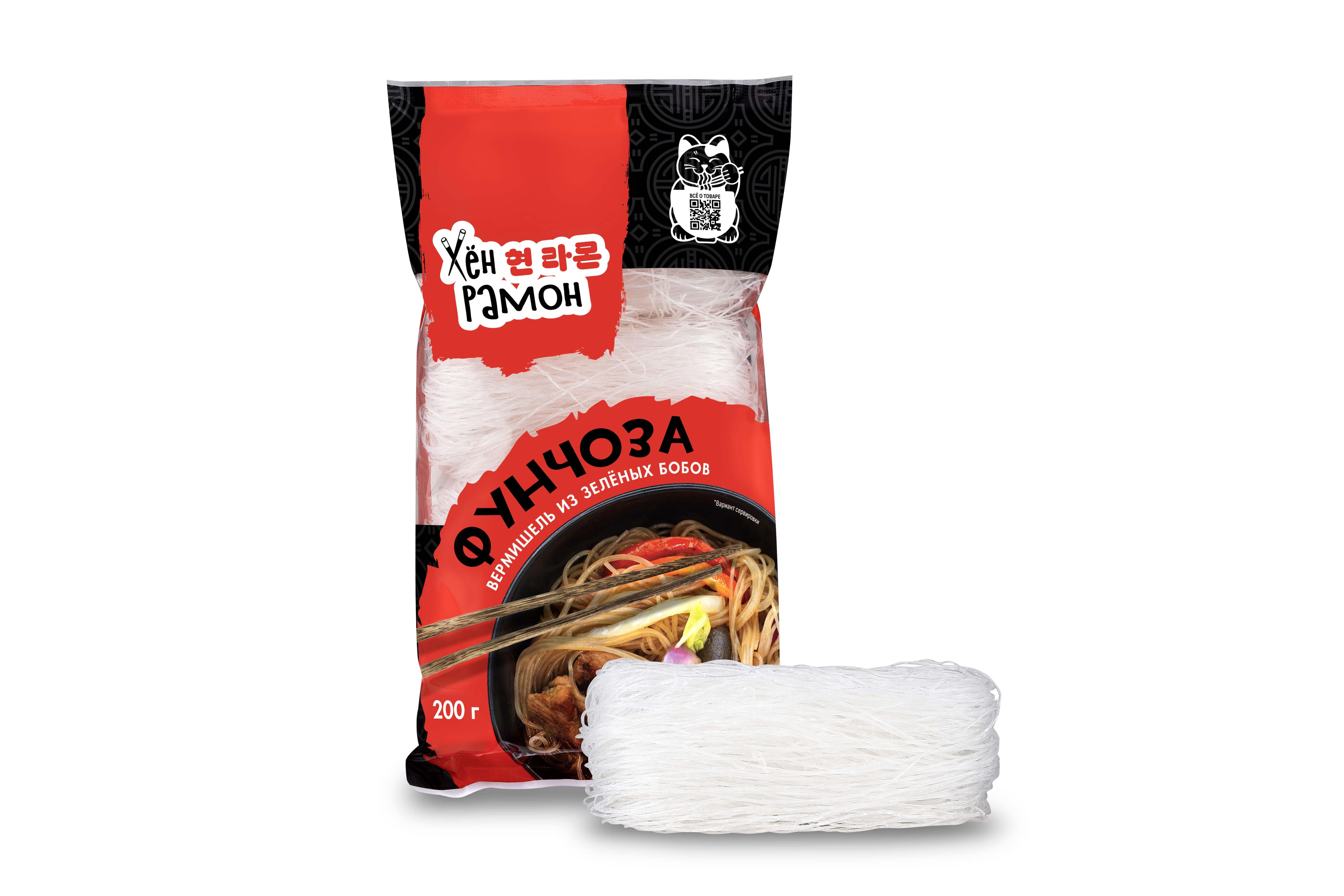 Фунчоза высшего сорта ТМ "ХёнРамон" — это вермишель из зелёных бобов, экзотический гарнир к восточным деликатесам и основа для многих блюд азиатской кухни. Она хорошо впитывает вкус и аромат соусов, не требует варки. Фунчоза высшего сорта ТМ "ХёнРамон" отлично сочетается с овощами, грибами, курицей, говядиной и морепродуктами для приготовления корейских салатов, супов и гарниров. Специальная технология производства сохраняет максимум полезных свойств зелёных бобов: витамины группы В, фосфор, кальций, цинк, железо, селен и др. Бобовая вермишель подходит для вегетарианского и здорового питания. ХёнРамон - 현 라몬