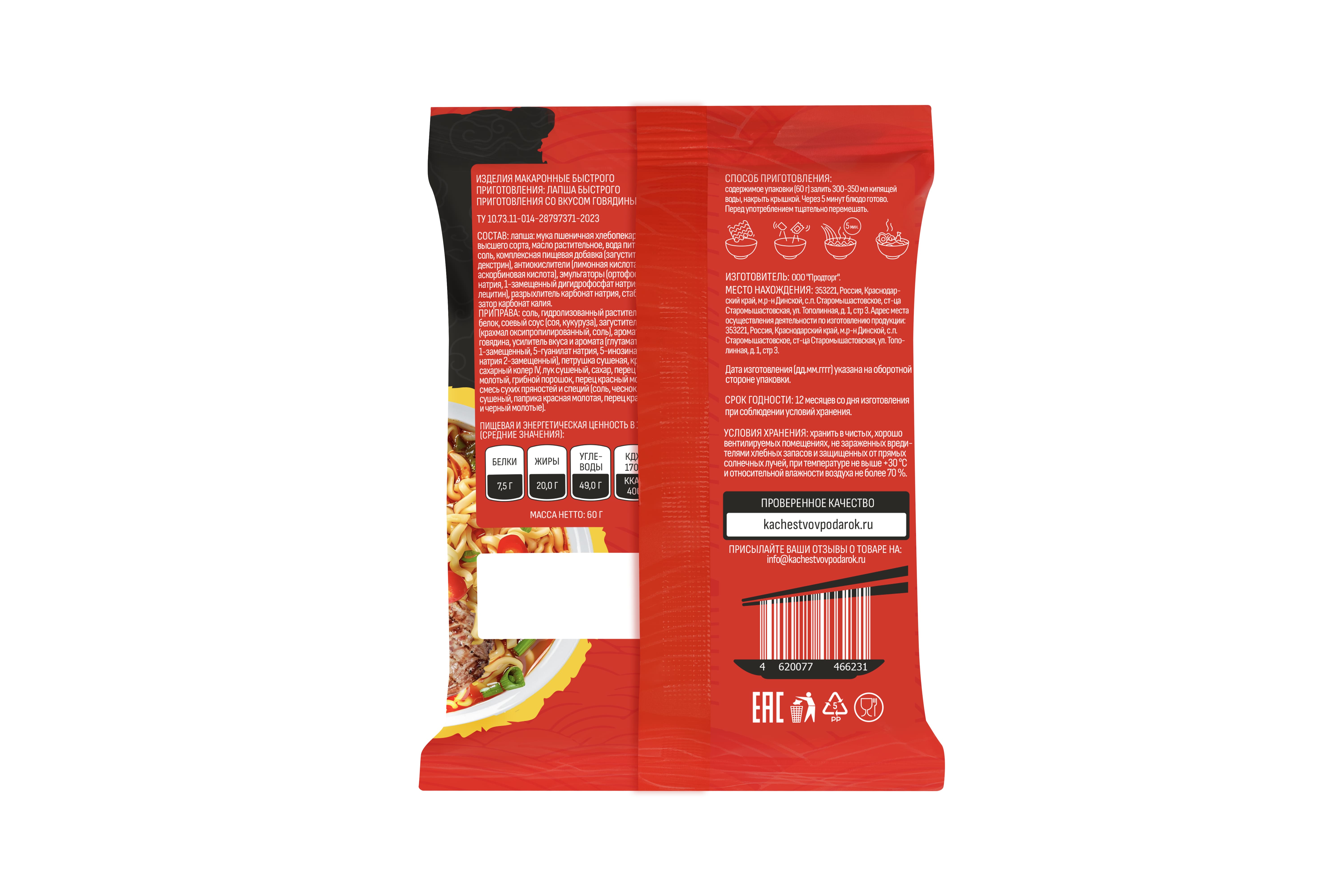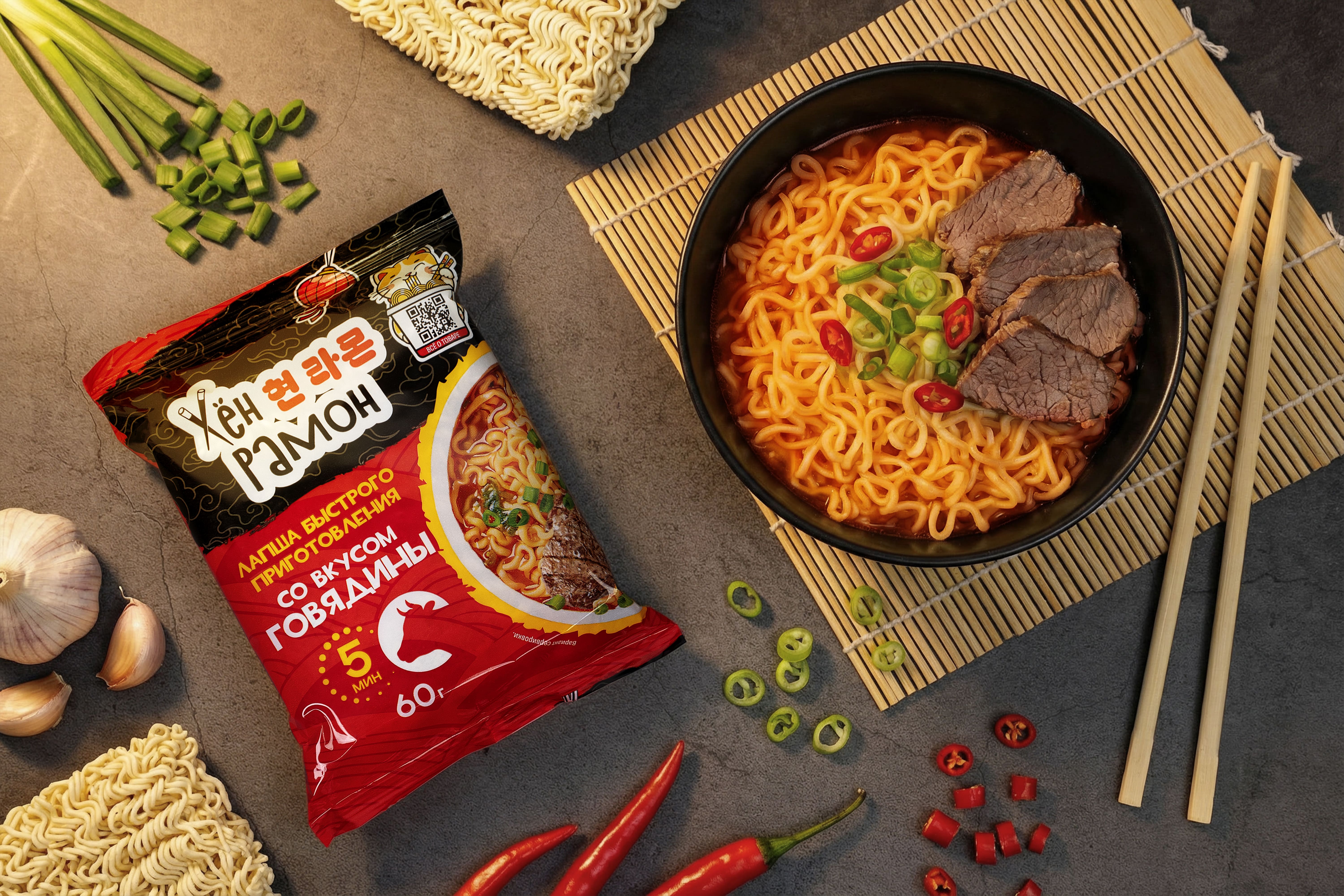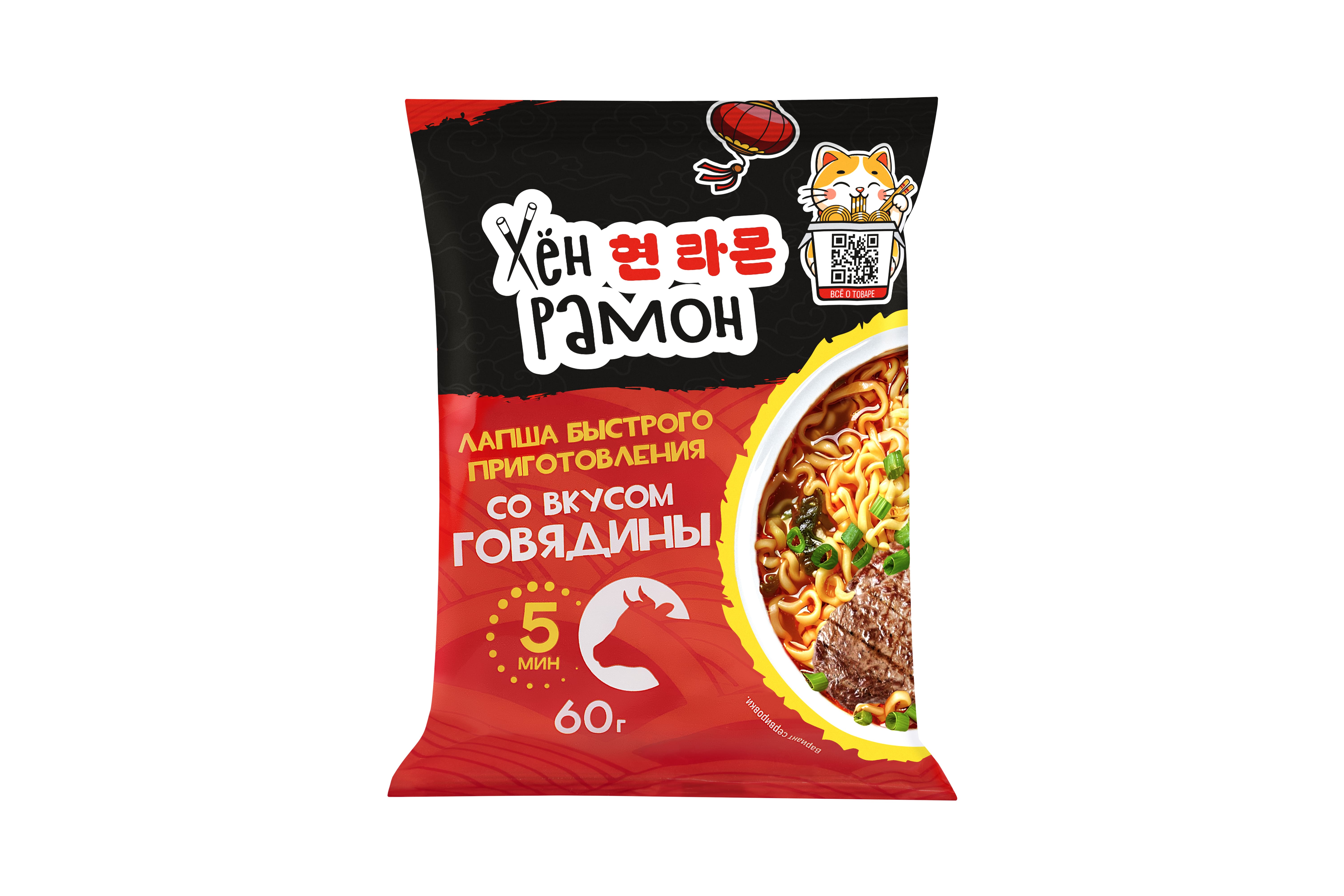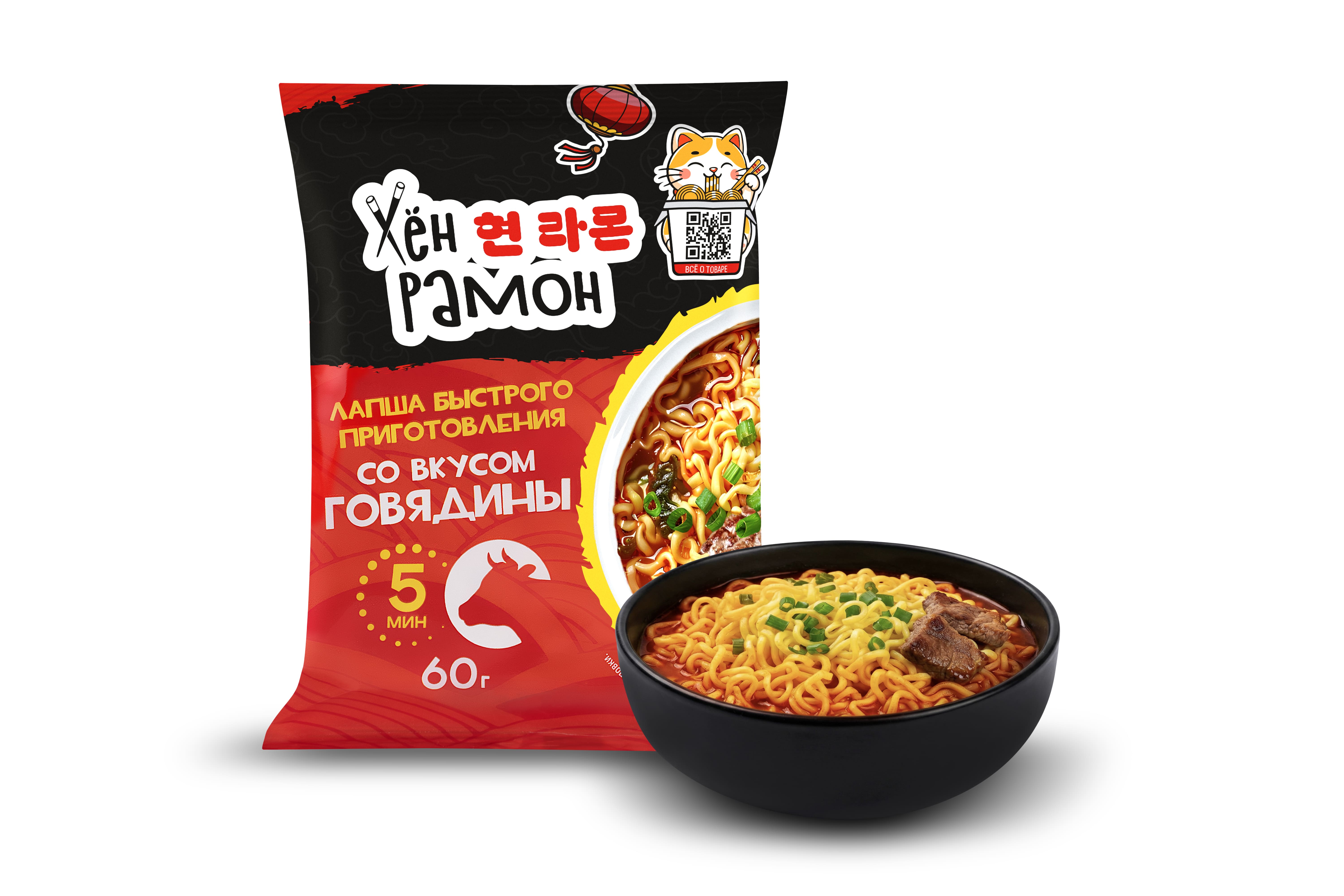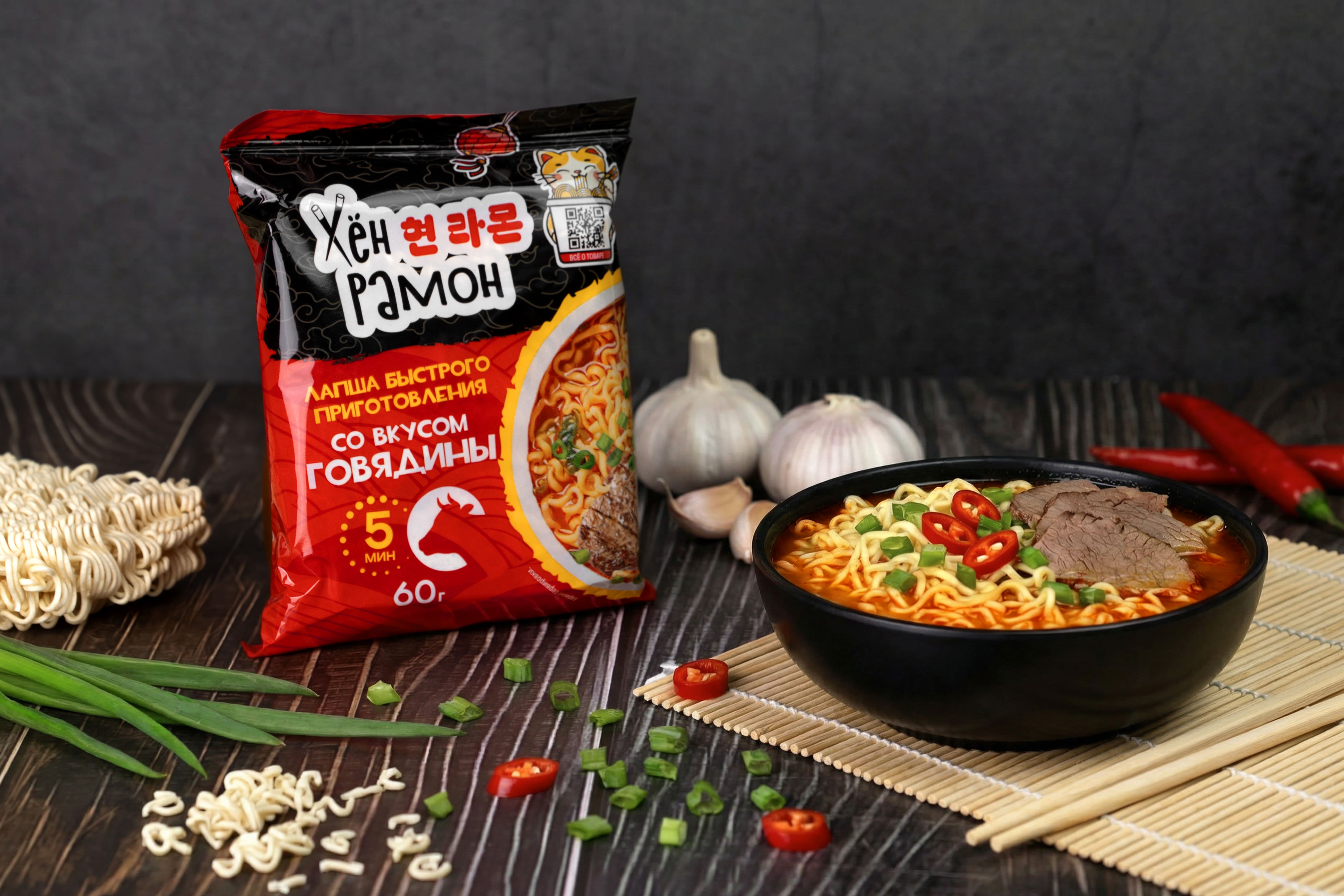 Лапша со вкусом говядины ТМ "Хен Рамон", 60г — это изделия макаронные быстрого приготовления, изготовленные из муки высшего сорта с добавлением натуральных специй и пряностей. Это блюдо - идеальное решение для тех, кто ценит своё время и хочет вкусно поесть без долгой готовки. Для приготовления содержимое упаковки 60г залить 300-350 кипящей водой, накрыть крышкой. Через 5 минут блюдо готово. Перед употреблением тщательно перемешать. Порция в 60 грамм - отличный вариант для лёгкого перекуса на работе, в дороге, на учёбе или дома. Лапша ТМ "Хен Рамон" порадует вас насыщенным вкусом и ароматом говядины. ХёнРамон - 현 라몬