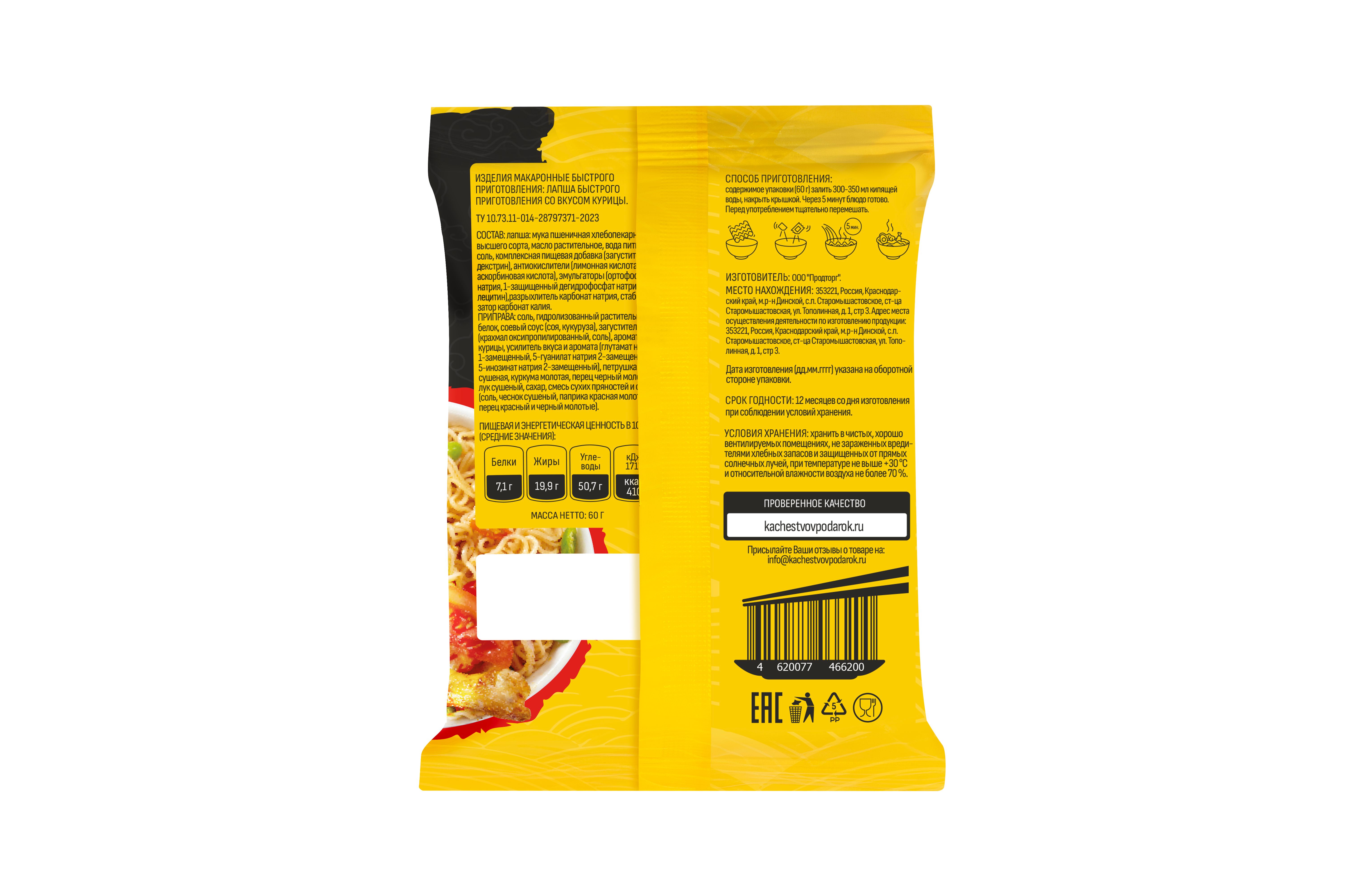 Лапша: мука пшеничная хлебопекарная высшего сорта, масло растительное, вода питьевая, соль, комплексная пищевая добавка(загуститель декстрин), антиокислители (лимонная кислота, аскорбиновая кислота), эмульгаторы (ортофосфат натрия, 1-защищенный дегидрофосфат натрия, летицин), разрыхлитель карбонат натрия, стабилизатор карбонат калия. Приправа: соль, гидролизованный растительный белок, соевый соус (соя, кукуруза), загуститель (крахмал оксипропилированный, соль), ароматизатор курицы, усилитель вкуса и аромата (глутамат натрия 1-замещенный), 5-гуанилат натрия 2- замещенный, 5-ионизат натрия 2-замещенный, петрушка сушеная, куркума молотая, перец черный молотый, лук сушеный, сахар, смесь сухих пряностей и специй (соль, чеснок сушеный, паприка красная молотая, перец красный и черный молотые)