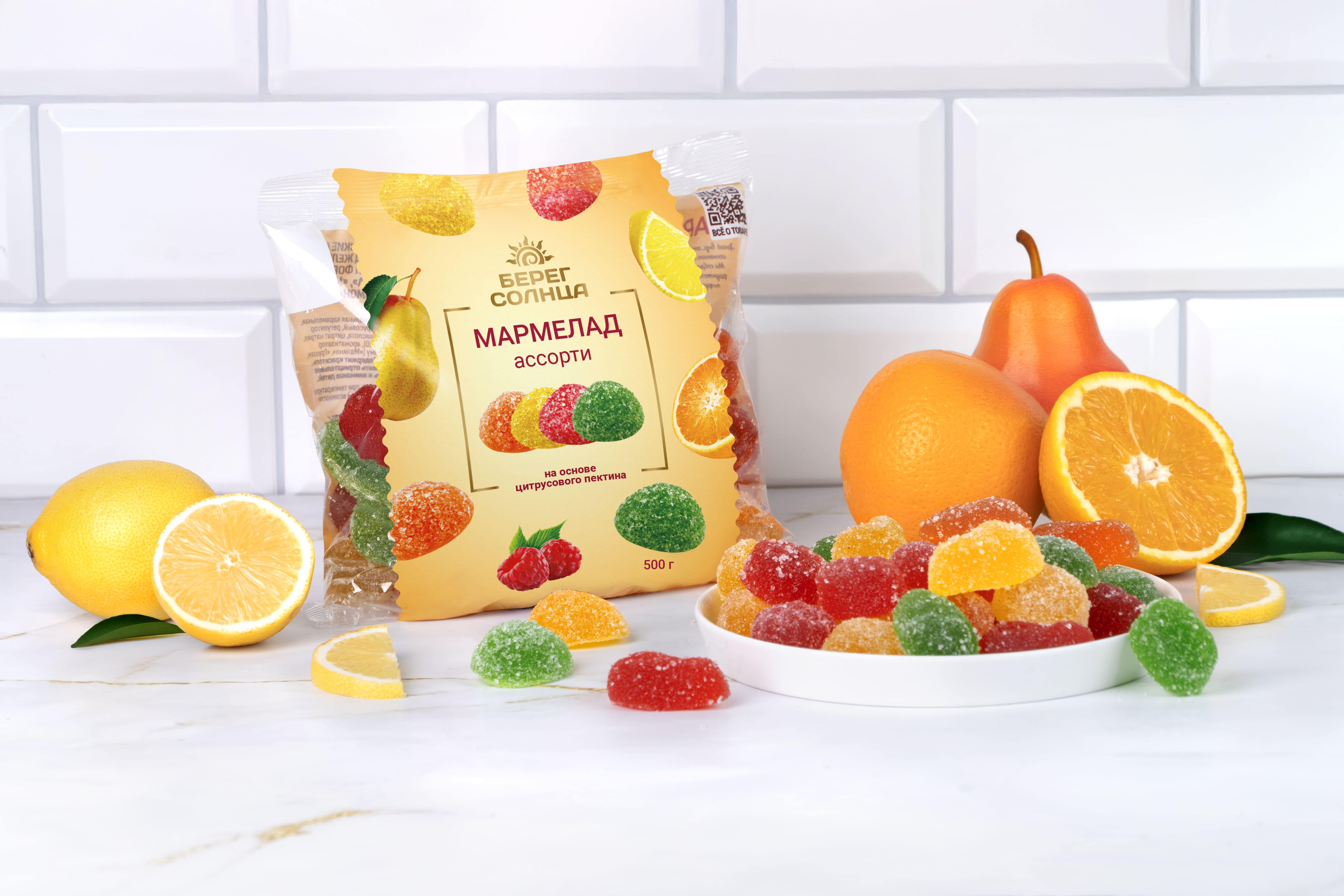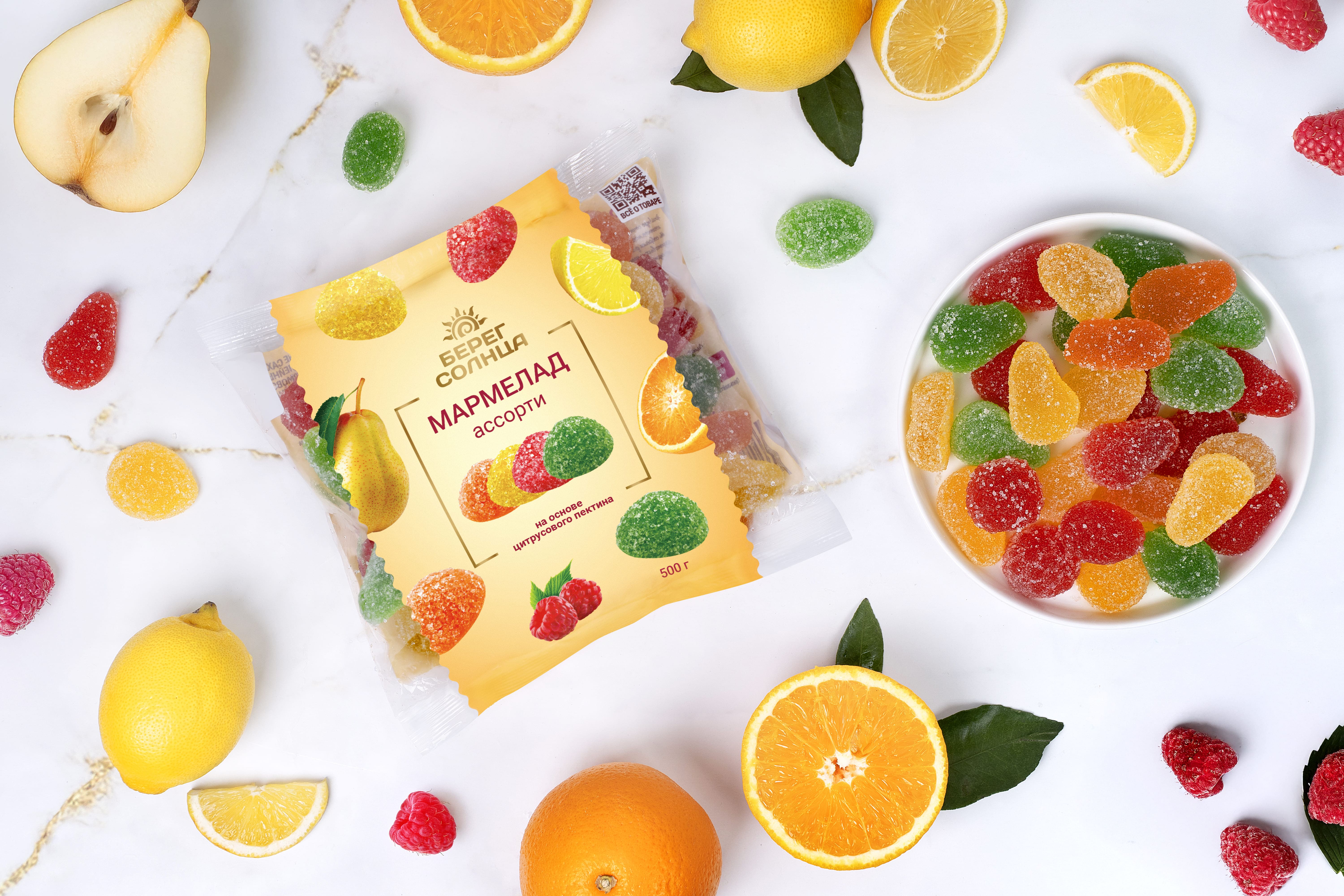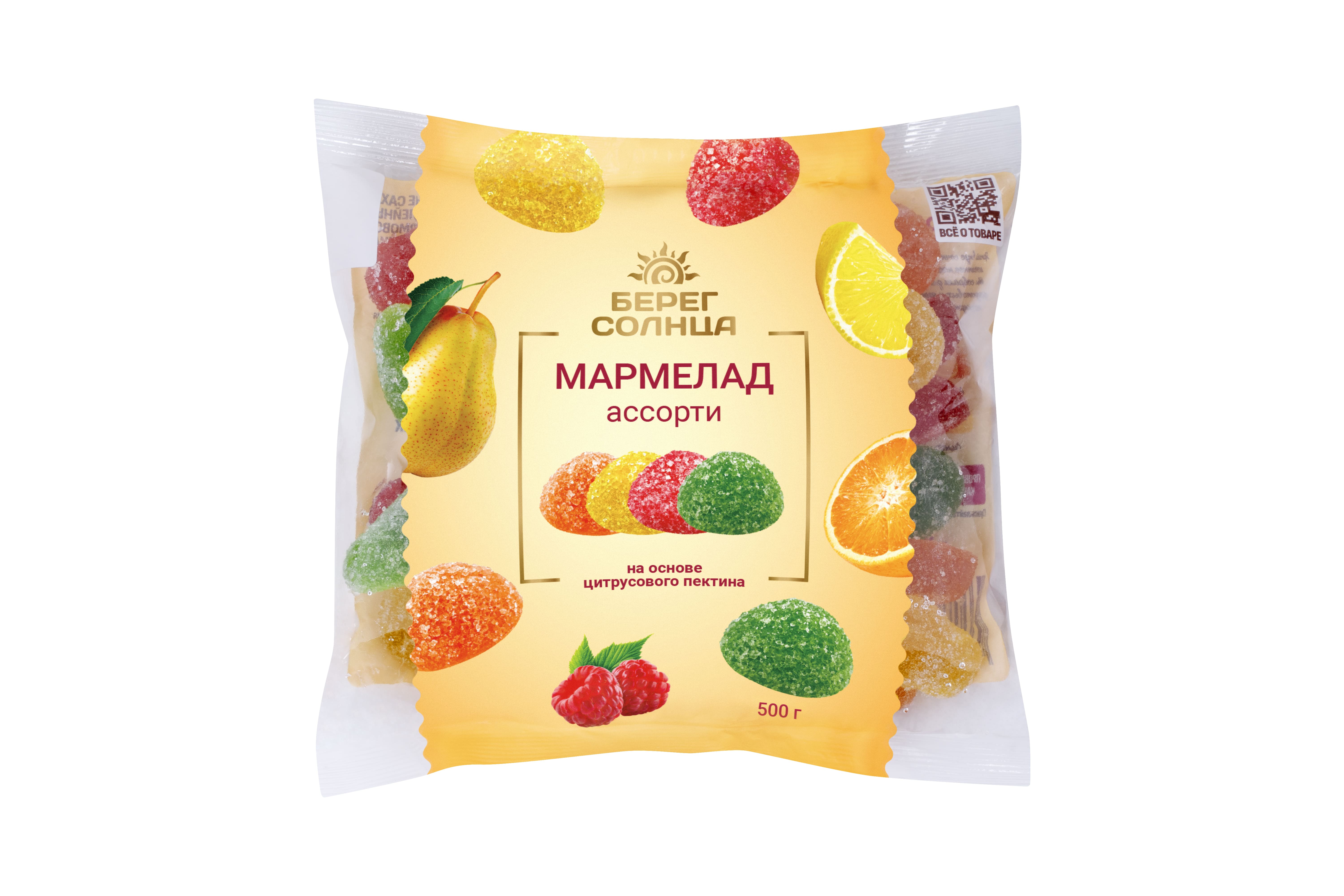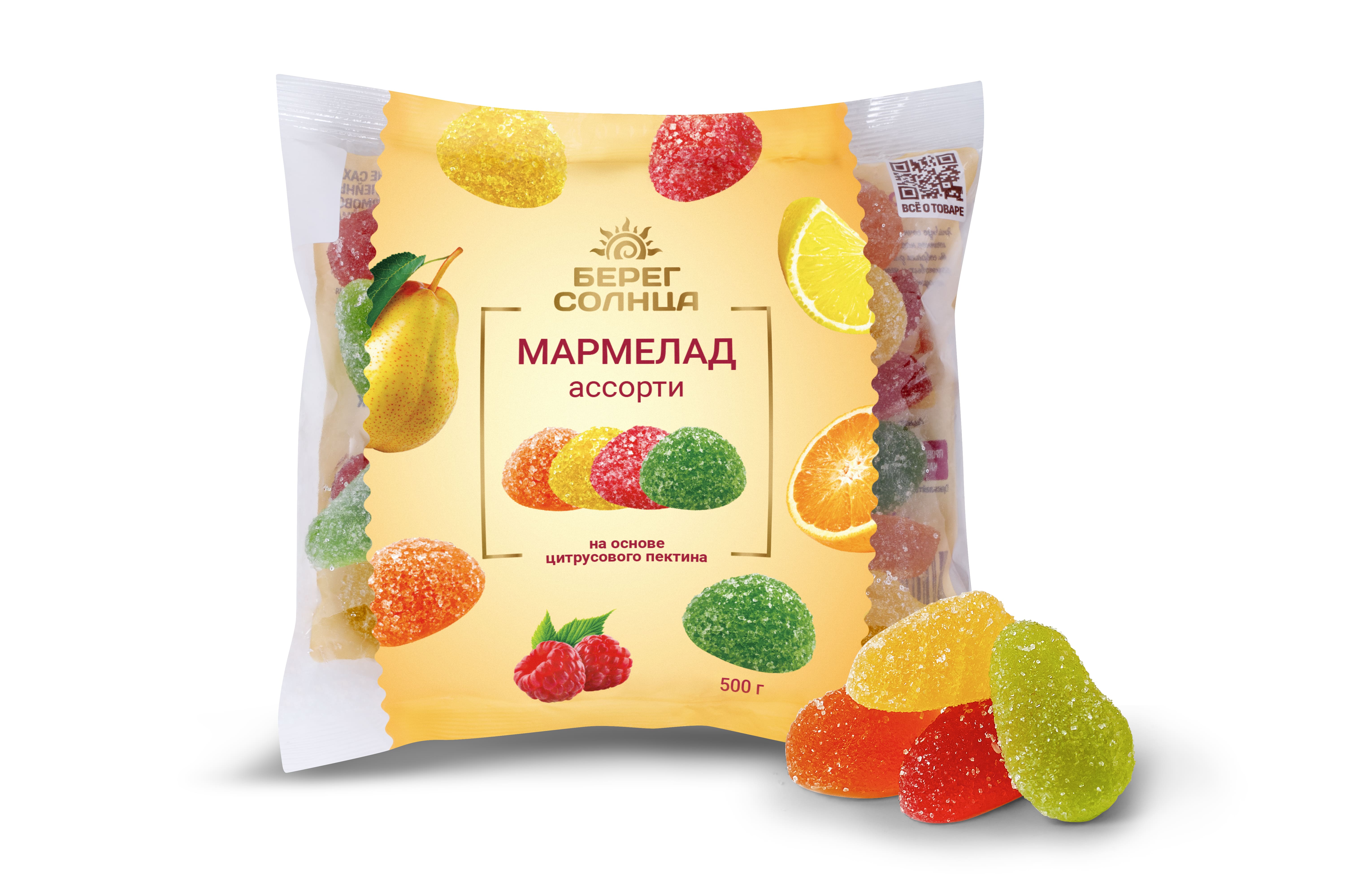 Мармелад “Ассорти” ТМ “Берег солнца” – это желейный неглазированный формовой мармелад с разными вкусами. Продукт произведен в строгом соответствии с ГОСТ 6442-2014, имеет безопасный состав, приятную жевательную текстуру и оригинальный вкус груши, малины, апельсина и лимона. В нем много натрия, кальция, калия, фосфора, магния и железа благодаря натуральному цитрусовому пектину в составе. Мармелад “Ассорти” ТМ “Берег солнца” – это вкусное и полезное лакомство для взрослых и детей. Большой упаковки 500 грамм хватит на всех!