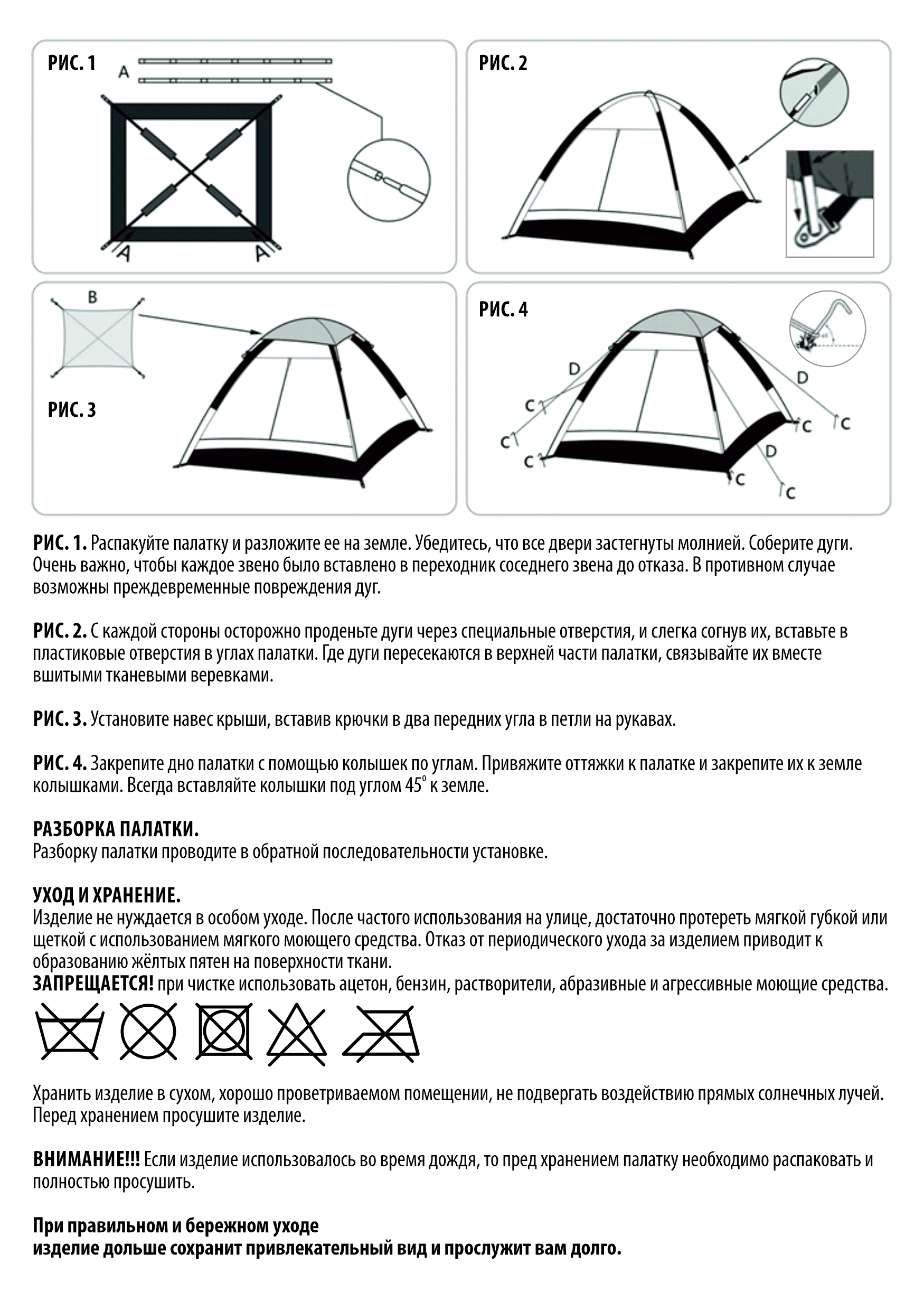 В комплекте: палатка, навес для крыши, москитная сетка, дуги - 2 шт., колышки – 8 шт., оттяжки – 4 шт., чехол, инструкция.