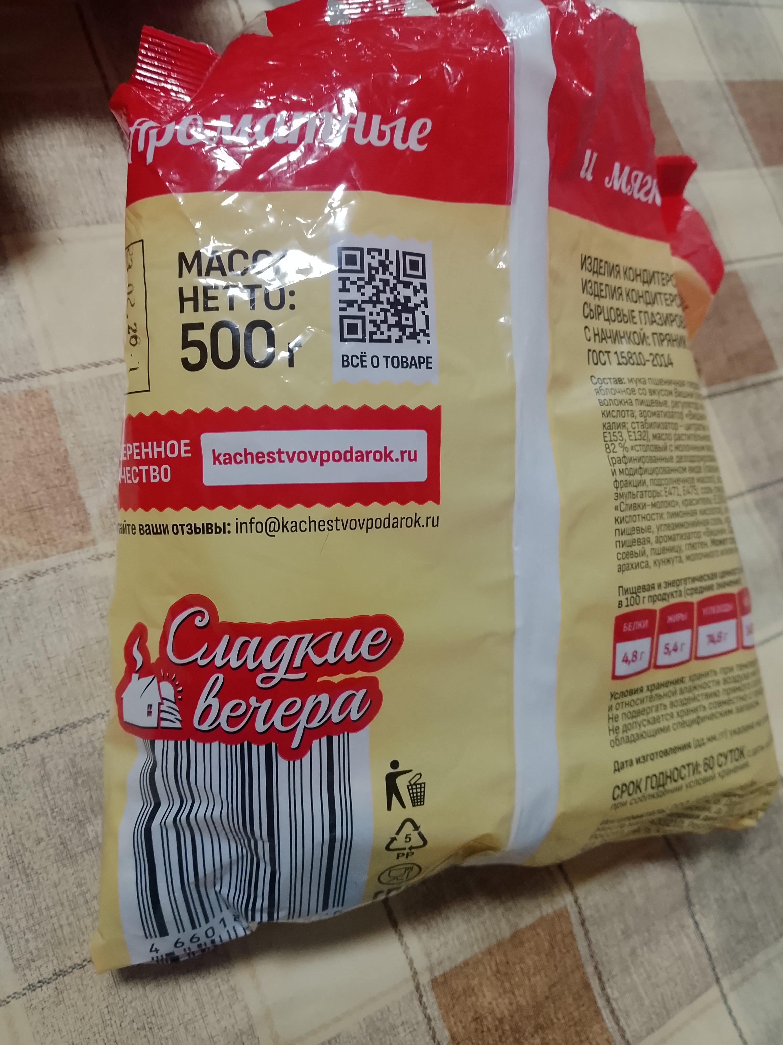 Пряники с вишневой начинкой ТМ “Сладкие вечера” – это ароматные мягкие пряники с сочным фруктовым повидлом внутри. Пряники произведены из натуральных ингредиентов в строгом соответствии с ГОСТ 15810-2014. Удобной упаковки 500 г хватит, чтобы поделиться любимыми пряниками с друзьями и близкими. “Сладкие вечера” – это лакомства для души, с которыми каждый ваш вечер будет сладким.