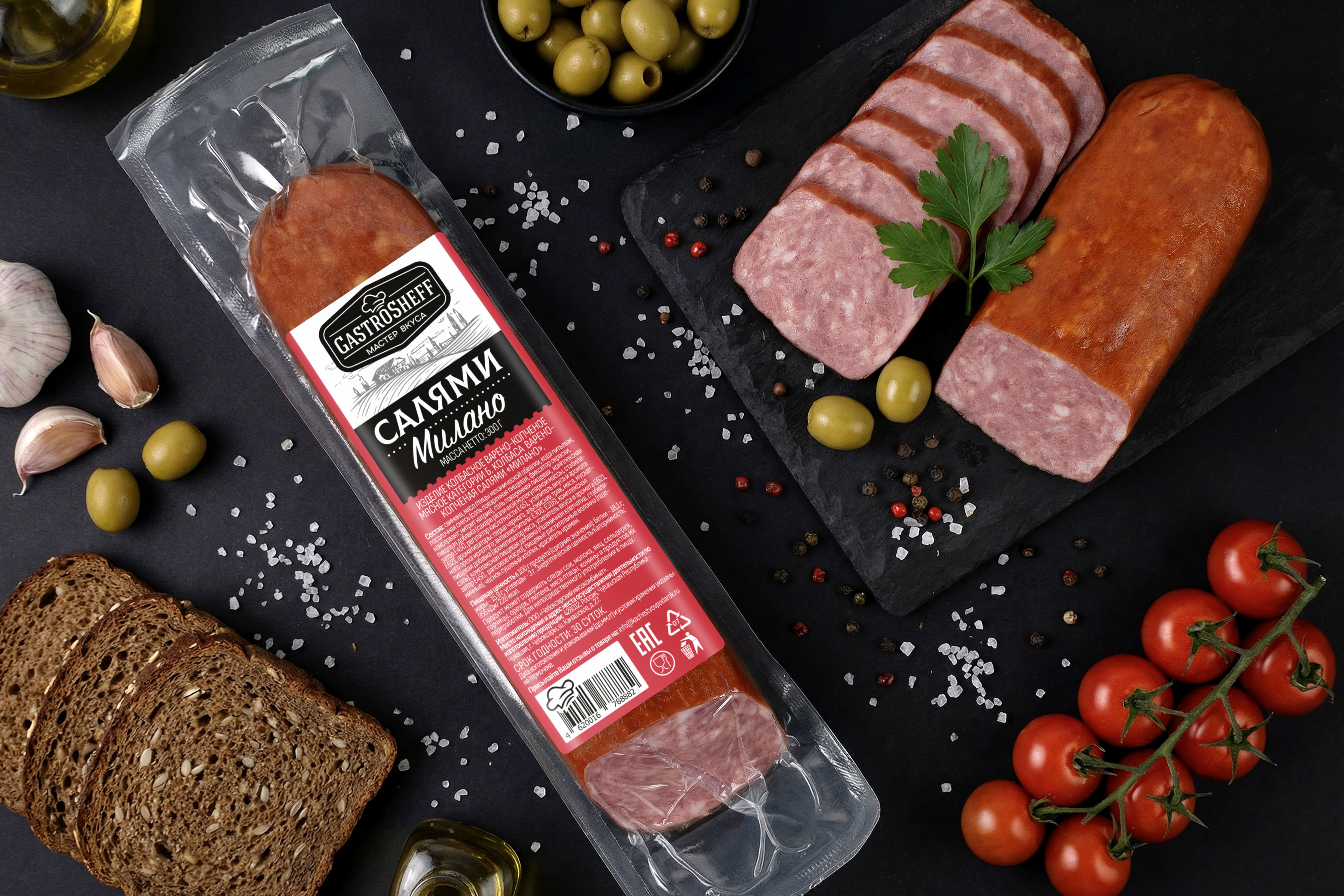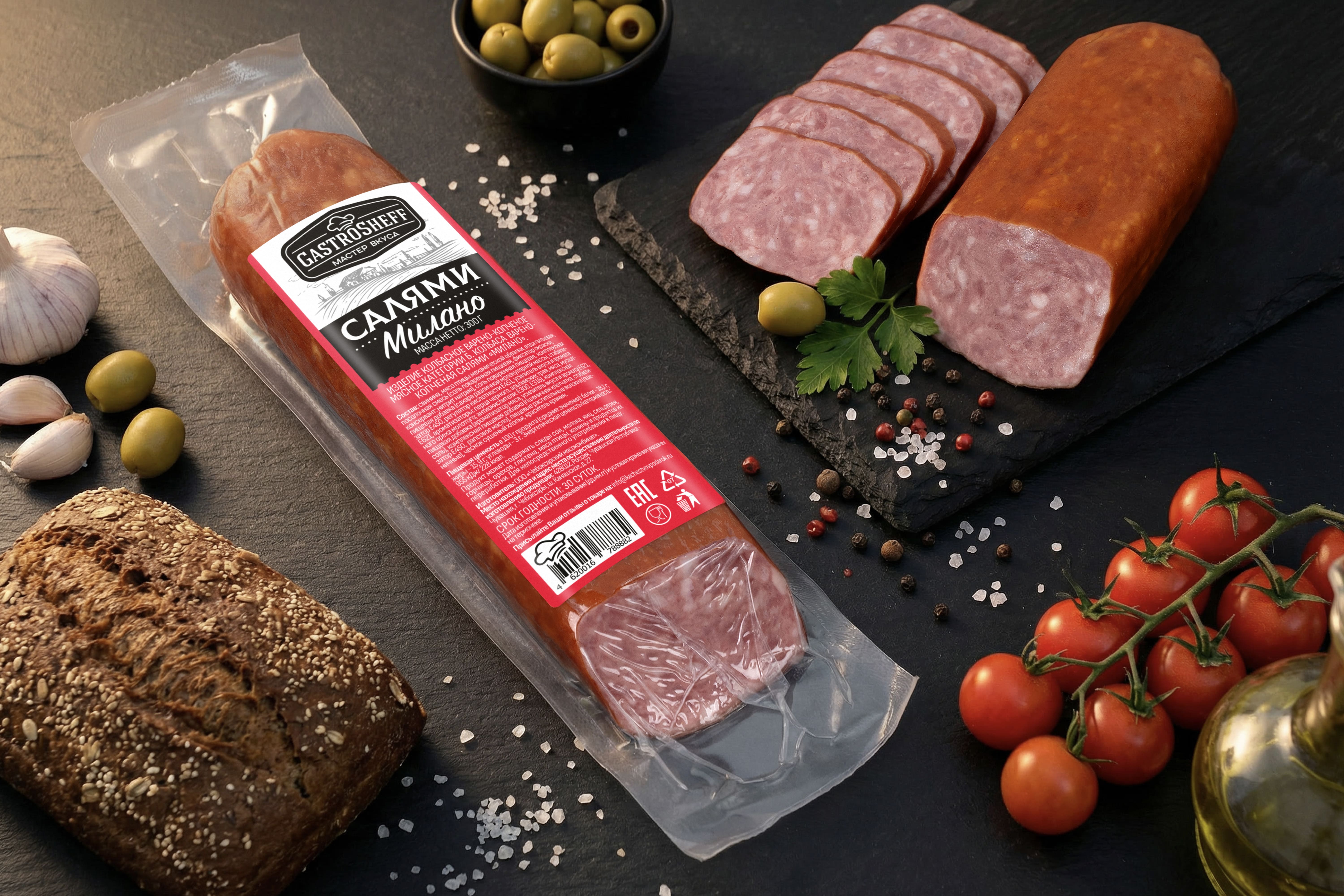 Салями "Милано" ТМ "GastroSheff", 300 г. — это изысканная варёно‑копчёная колбаса категории Б, изготовленная по классической рецептуре из отборного мяса с пряностями. Нежная текстура, благородный аромат копчения и тонкий баланс специй делают этот деликатес идеальным выбором для колбасной нарезки на праздничный стол. Салями также прекрасно подходит для приготовления бутербродов, сэндвичей, пиццы и других блюд. Салями «Милано» от «GastroSheff» — это сочетание итальянского колбасного мастерства и современных стандартов производства. «GastroSheff» — мастер вкуса!
