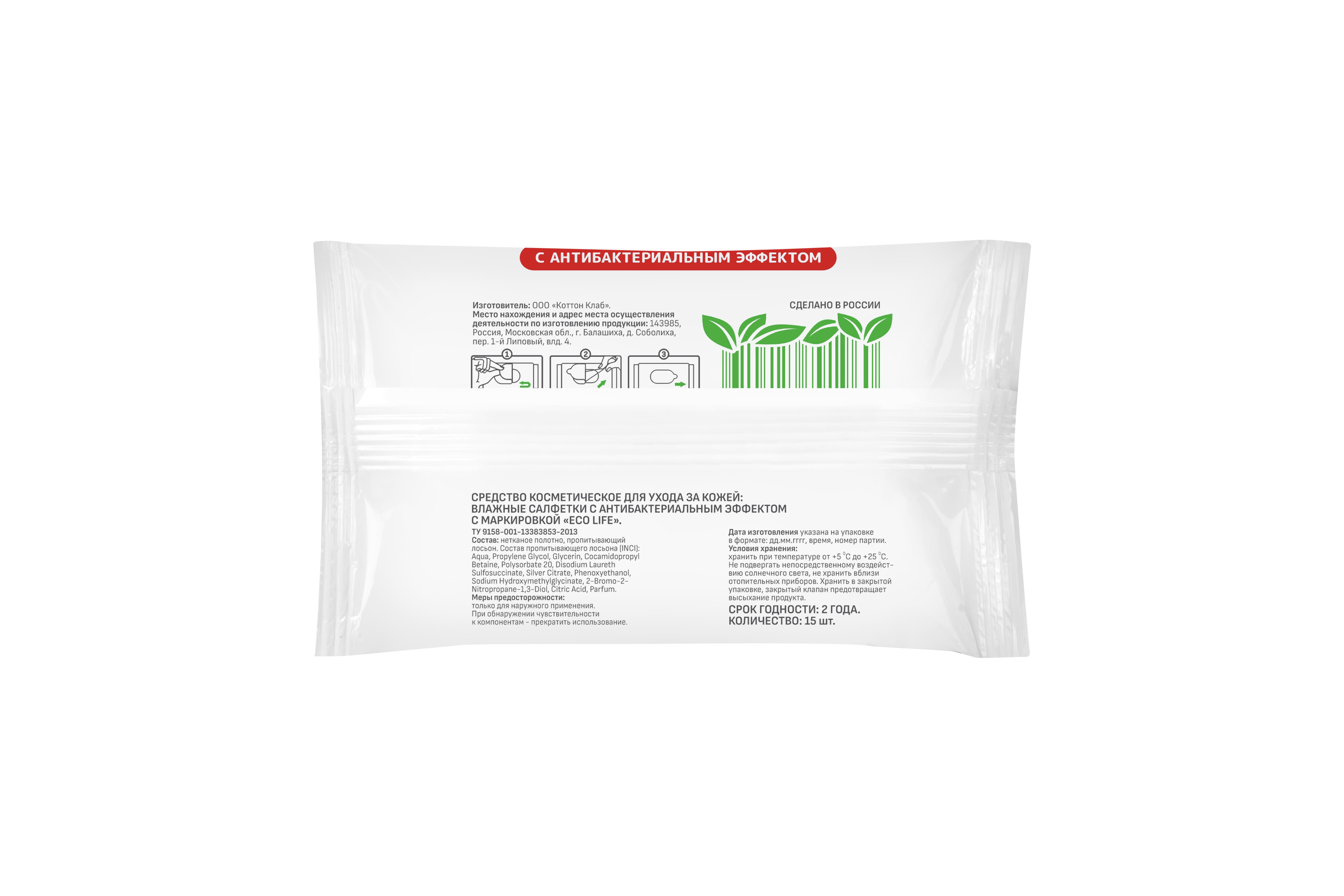 Влажные салфетки с антибактериальным эффектом "Eco Life", 15 шт