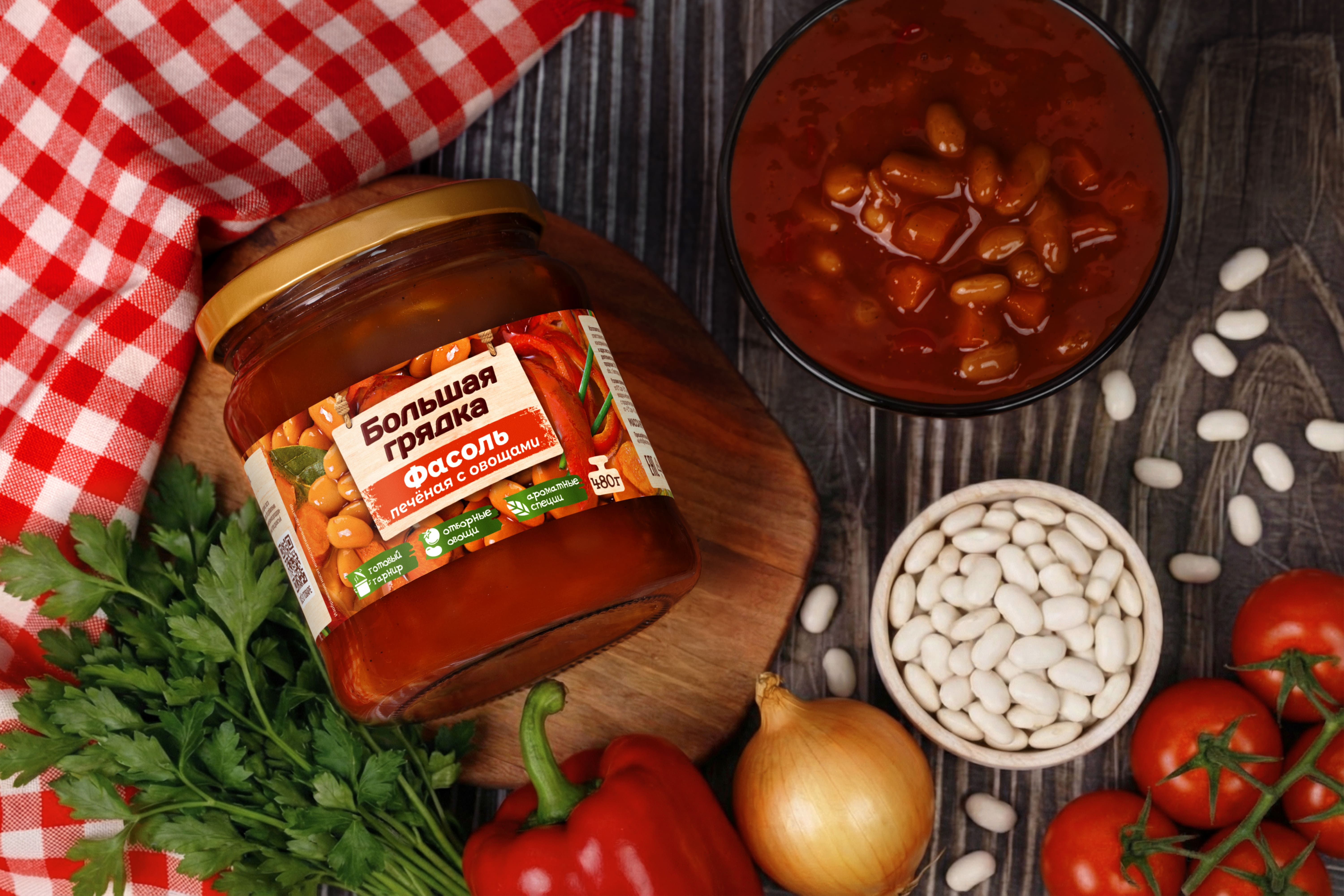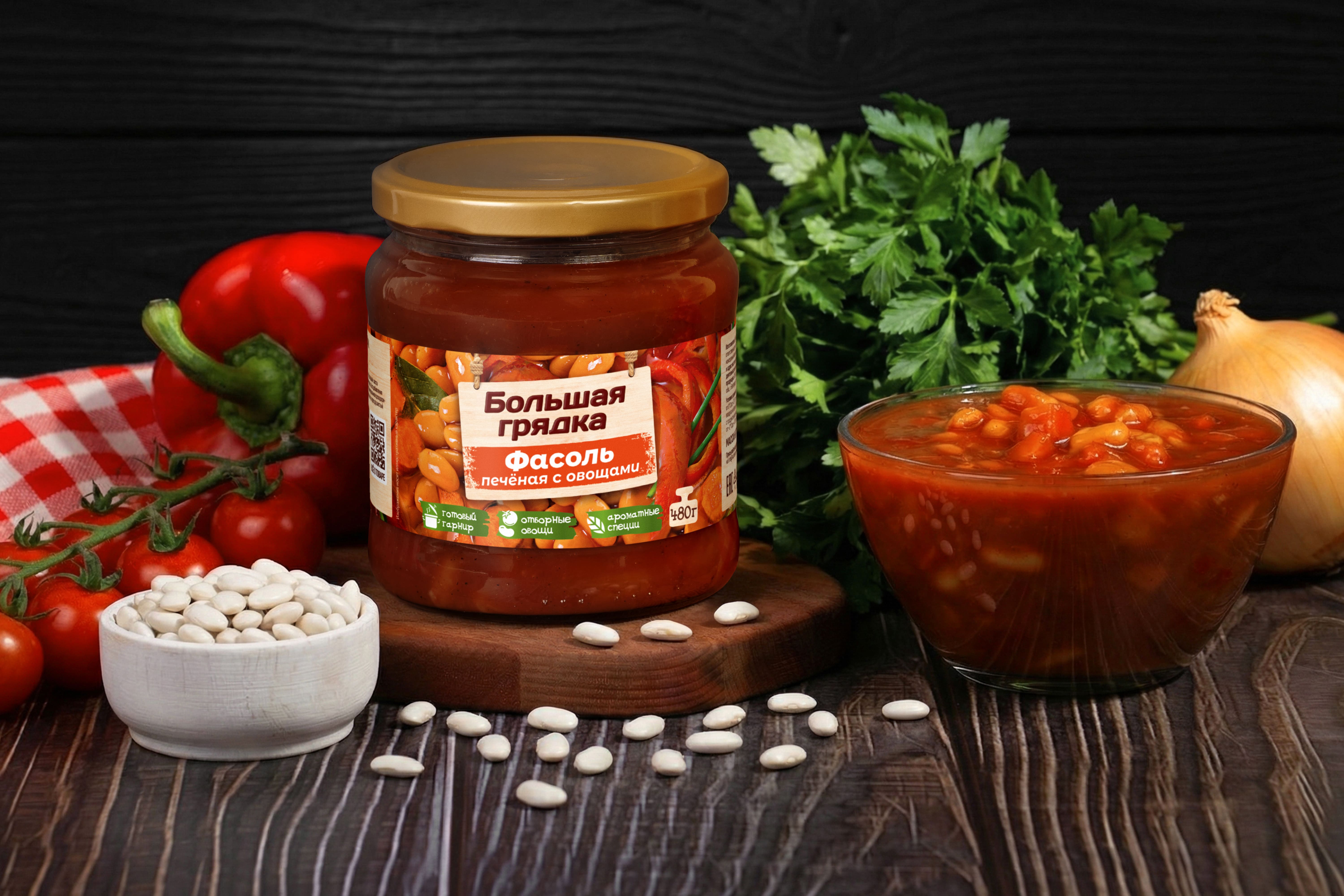 Фасоль печеная с овощами ТМ “Большая грядка” – это не только вкусная и питательная закуска, но и полезное блюдо. Фасоль богата белком и клетчаткой, а отборные овощи в ее составе витаминами и микроэлементами. Продукт имеет натуральный чистый состав без консервантов и усилителей вкуса и подходит для людей, придерживающихся правильного питания. Вы можете насладиться этой сытной закуской, подав ее в качестве гарнира к основному блюду, или создать целостное блюдо, дополнив ее другими ингредиентами по вашему вкусу. Благодаря свежим региональным ингредиентам и натуральной рецептуре продукция “Большая грядка” имеет особый домашний вкус, близкий и понятный каждому!