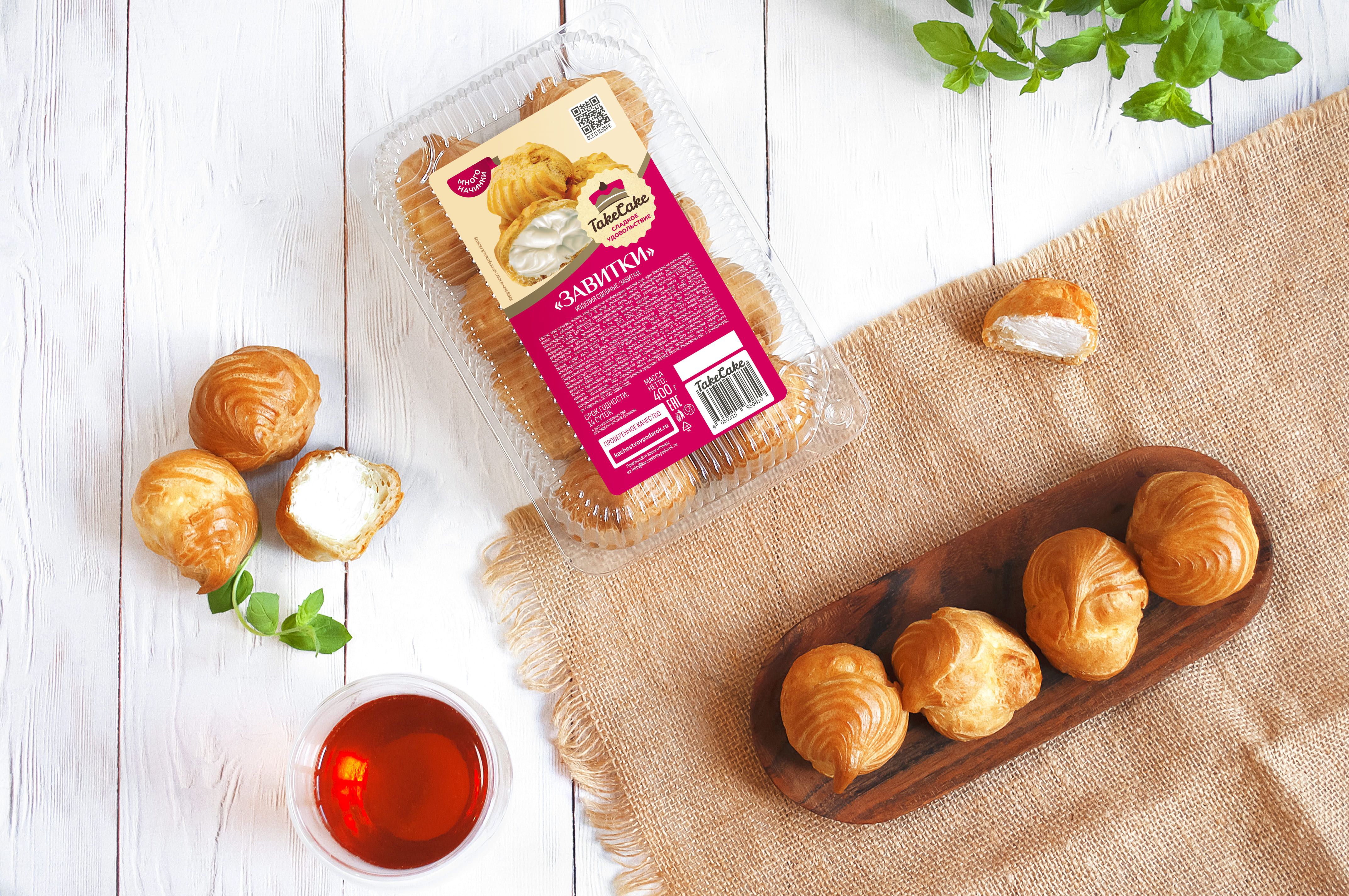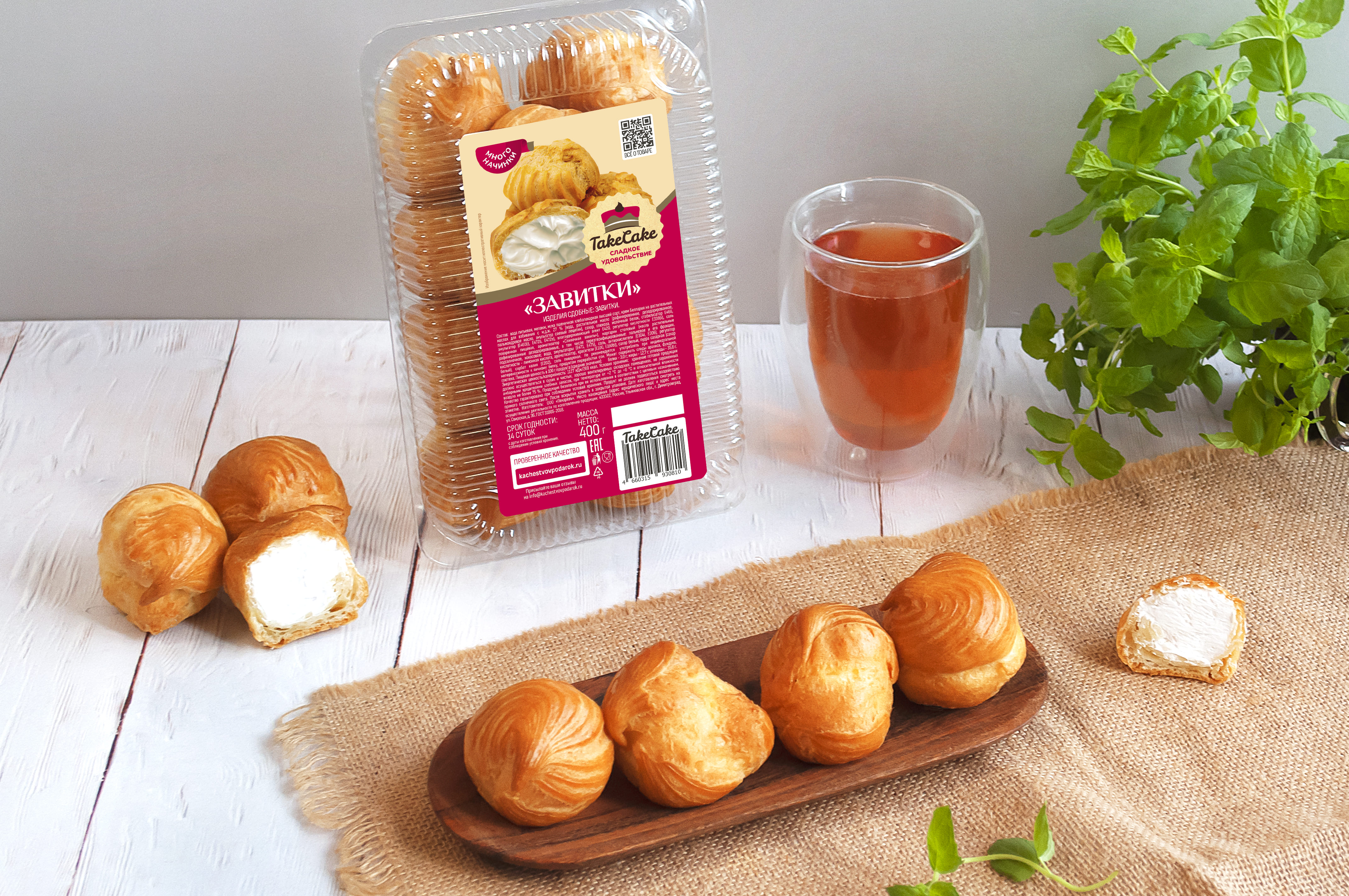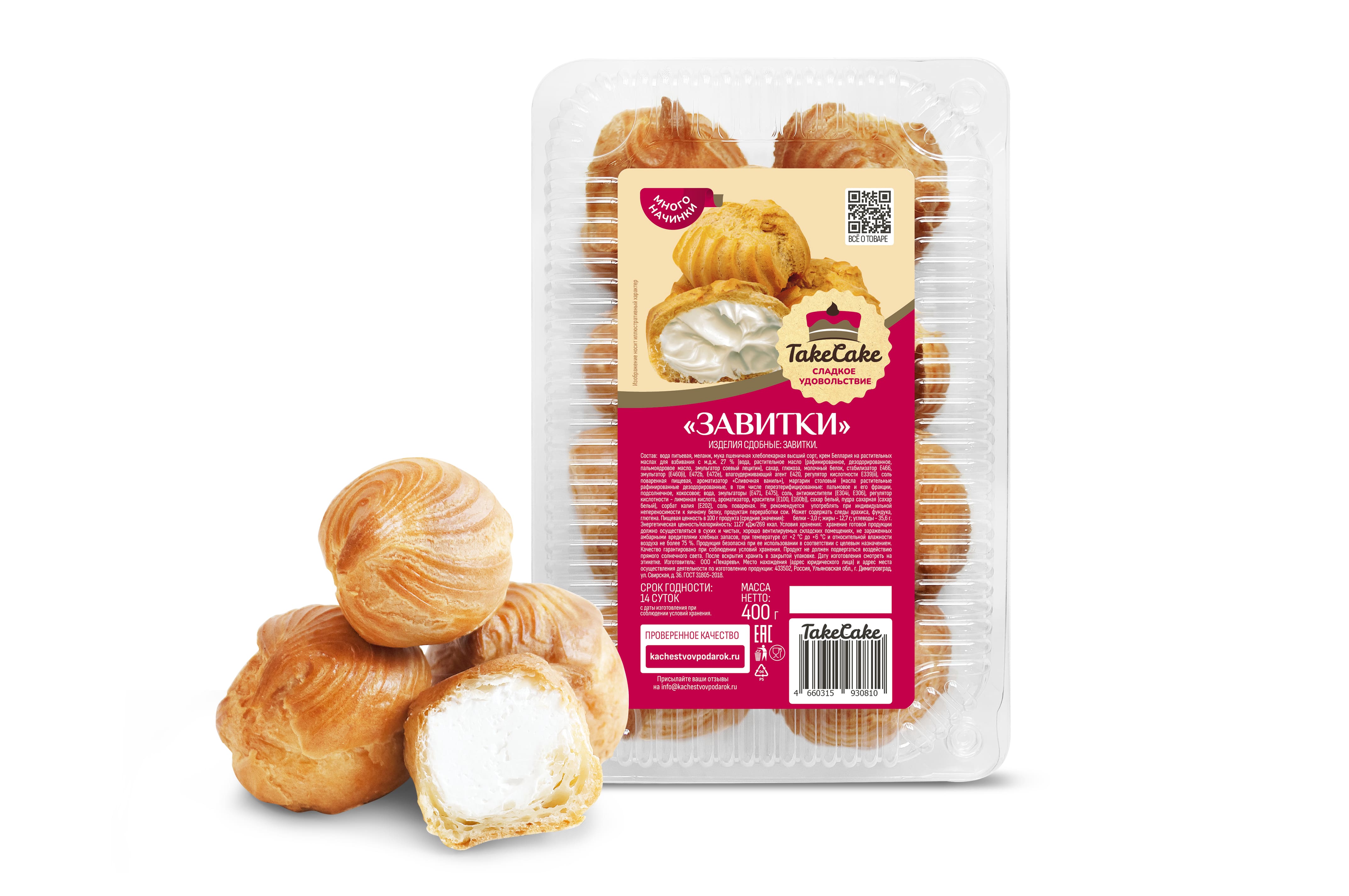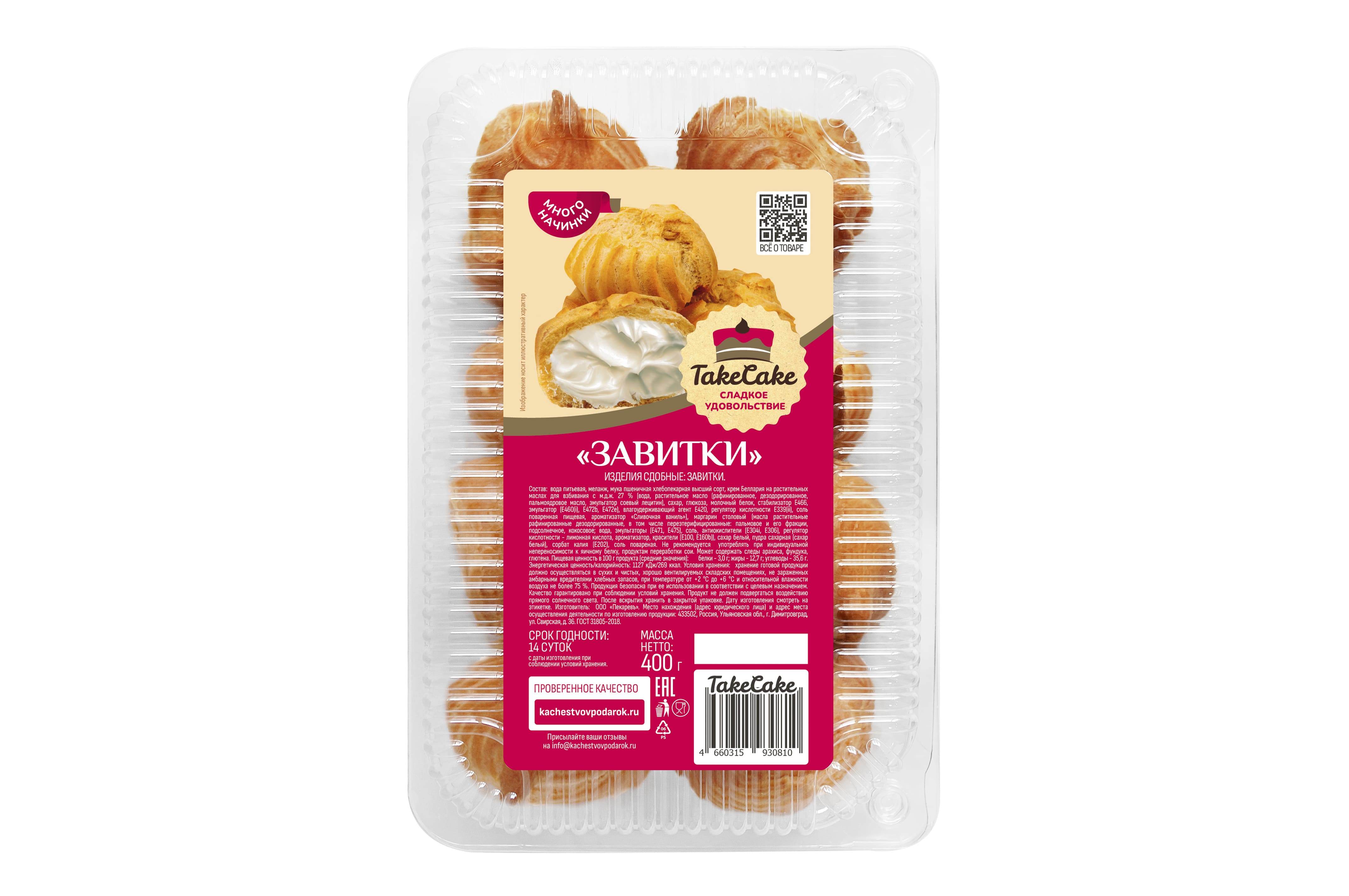 Пирожные "Заварные завитки" ТМ "Take Cake" — изделия сдобные, изготовленные из хлебопекарной пшеничной муки высшего сорта с добавлением большого количества начинки. Пирожное состоит из 40% теста и 60% крема (по весу). Десерт сладкий, не приторный с легким тестом и воздушным кремом. Нежно ванильный вкус и сливочно-ванильный аромат не оставит равнодушным. "Заварные завитки" станут отличным перекусом и приятным дополнением к Вашему уютному чаепитию. ТМ "Take Cake" - сладкое удовольствие!